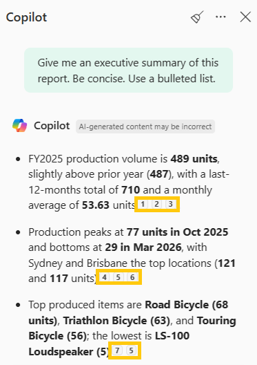 When Copilot generates a summary, you’ll see small reference numbers next to key statements.