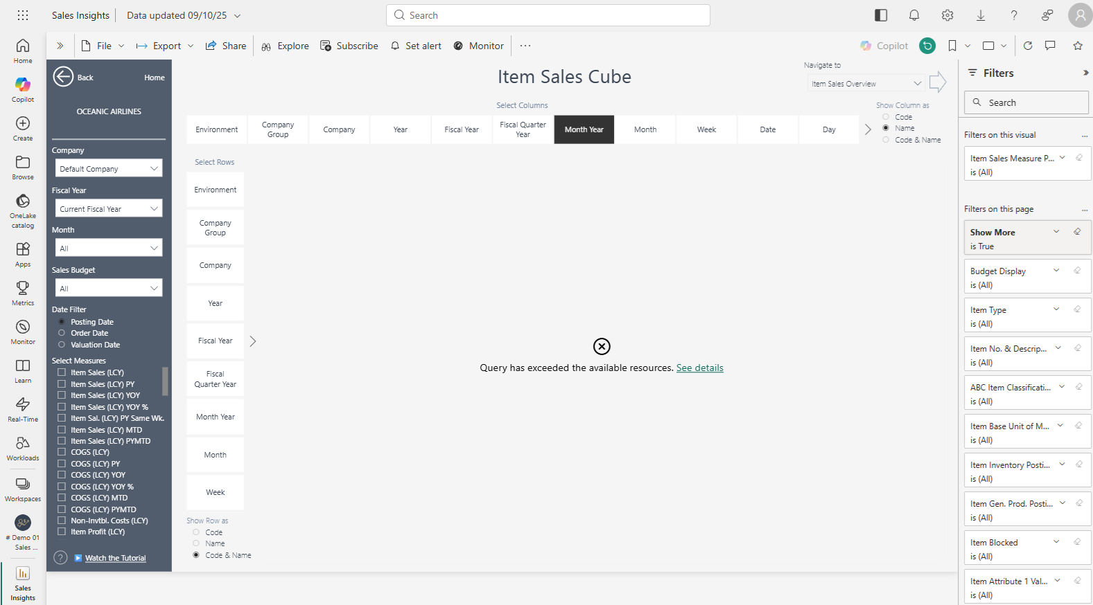 If none are selected, the system tries to compute every measure for every month and item, causing overload.