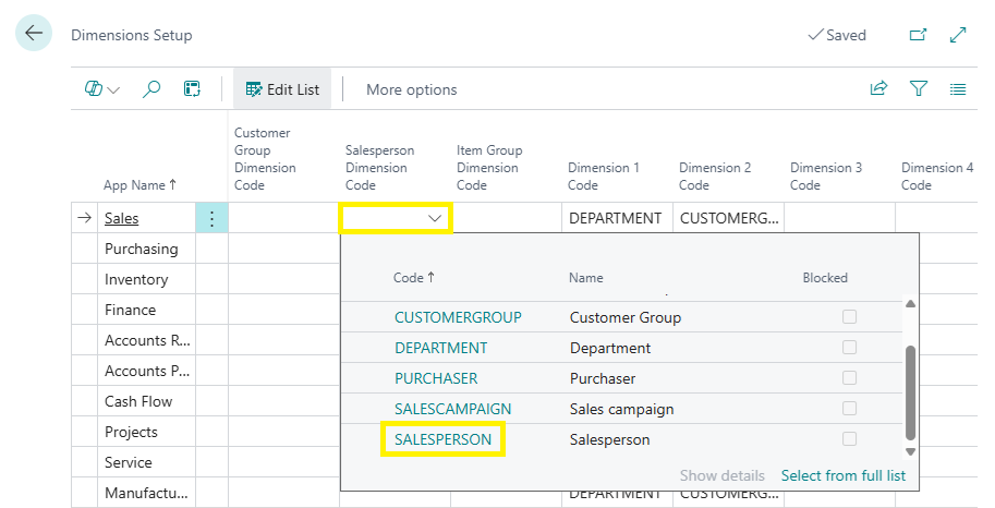 Step 2.2: Assign Salesperson to an available Shortcut Dimension slot