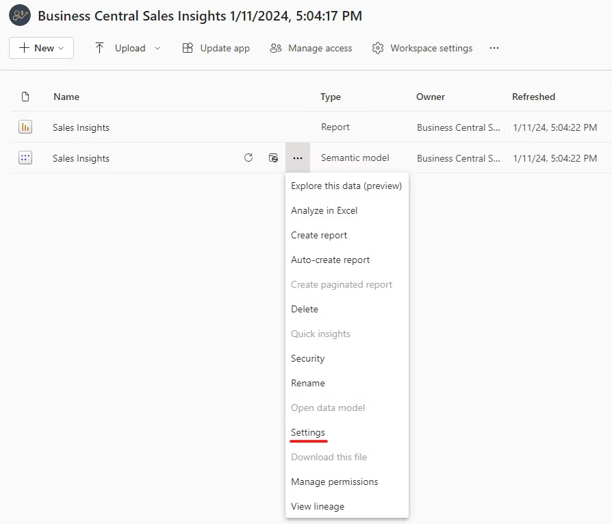 3.2 Open your Power BI workspace and dataset settings