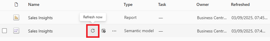 Back in the Workspace, choose Refresh now on the Semantic model to run a manual refresh.